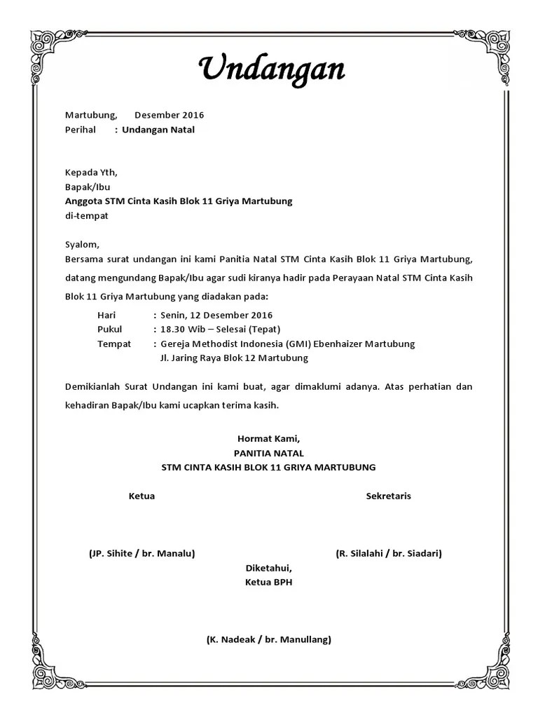 Berikut di bawah ini adalah beberapa contoh surat undangan natal yang bisa anda pergunakan untuk mengundang orang atau pihak lain menghadiri acara natal. Untuk hari natal memang harus dirayakan dengan sangat ramai sekali di rumah dan mengundang . Undangan natal · hari/tanggal : Panitia perayaan natal remaja dan naposobulung · hkbp griya martubung. Ressort medan martubung · medan, november 2017.